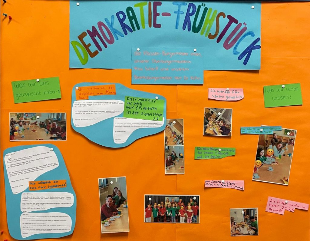 Am Montag waren Frau Scheff und Herr Dr. Kühn zum Frühstück mit unseren Klassenbürgermeister*innen bei uns. Unsere Klassenbürger*innen konnten als Vertretung für unsere Schule viele Fragen und Wünsche äußern. Ein spannender und lehrreicher Vormittag!